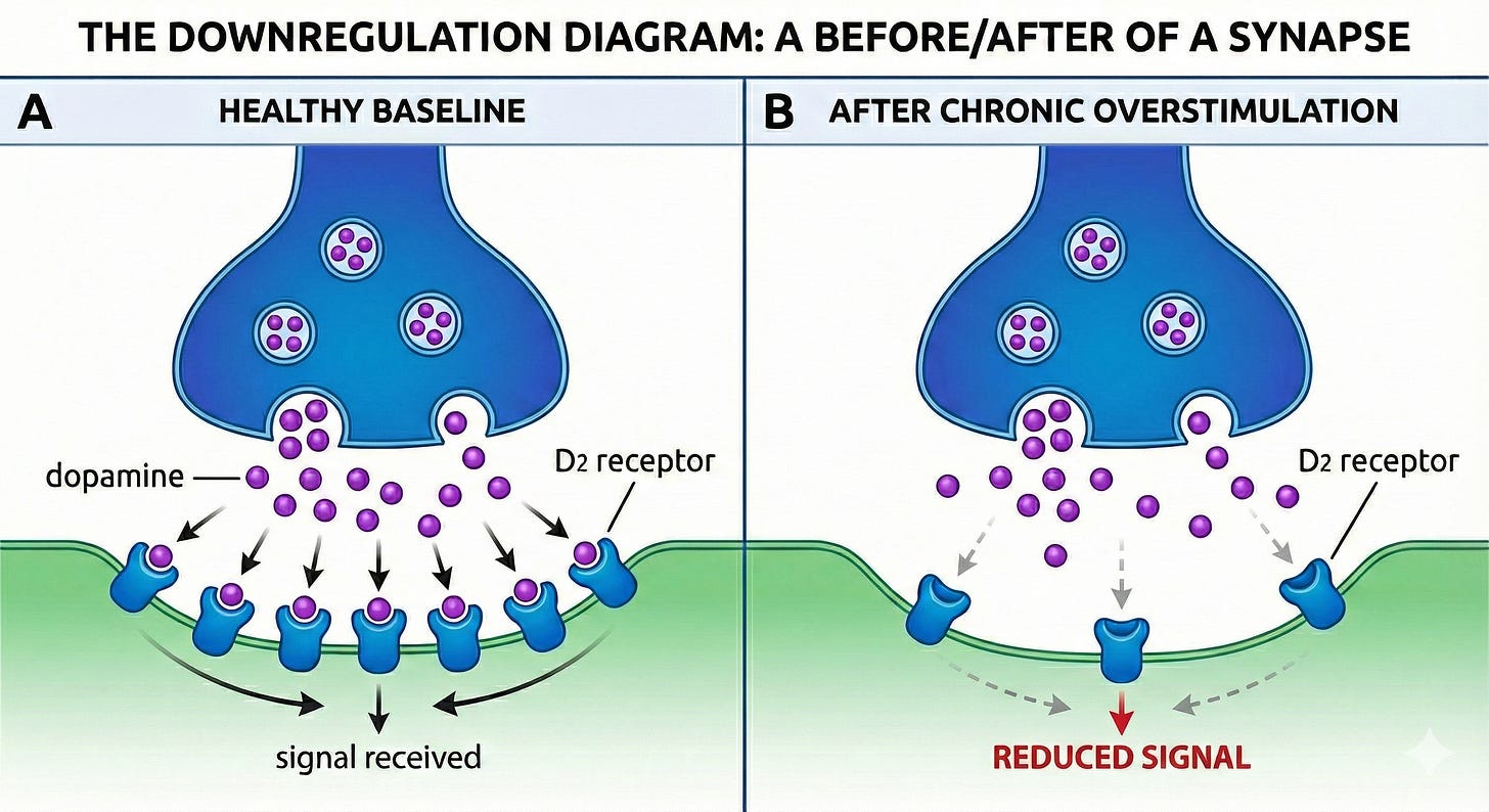 The same thing happens with dopamine. When the striatum (the brain’s reward-processing hub) gets flooded with dopamine repeatedly, its neurons start removing the receptors that pick up the signal. This is called downregulation. The dopamine is still being released. There are just fewer receivers left to detect it.