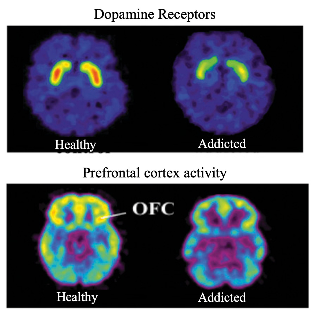 Researchers at the National Institute on Drug Abuse showed this by scanning the brains of addicted and healthy subjects. They identified that both the receptor levels (top row) and prefrontal activity (bottom row) are visibly dimmer in the addicted brain.